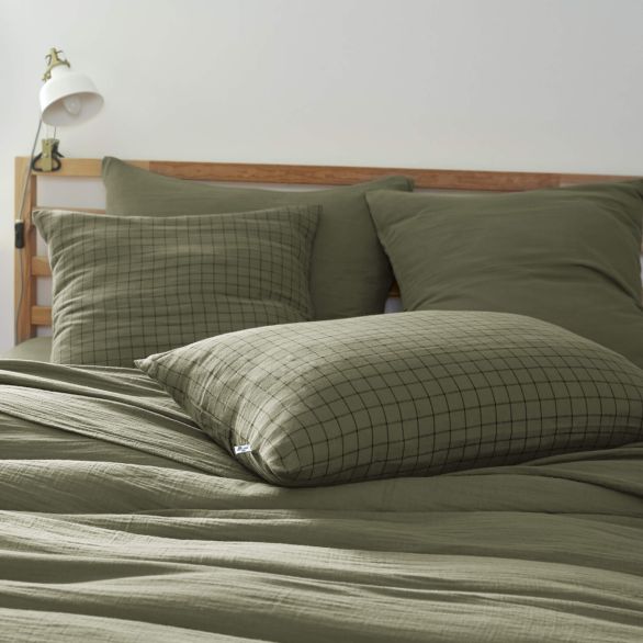 Taie d'oreiller à carreaux double gaze de coton kaki